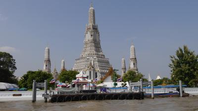 …Wat Arun, eine wunderschöne Tempelanlage, die neu renoviert wurde,wegen der Trauerfeierlichkeiten für den König, der ja vorgestern eingeäschert worden ist. Deshalb sind viele Teile von Bangkok noch sehr schön dekoriert. Jetzt, mit dem Expressboot über den Fluß zum Wat Pho…