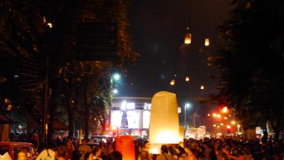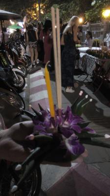 ...sind wir mit einem Pickup Taxi zum Platz am Fluß gefahren. Da war es schon sehr sehr voll. Wir haben uns dann Kratong's (schwimmende Blumenschiffchen) besorgt, um diese dann am Fluß...