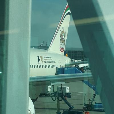 …zum Flugzeug, dass mit einer knappen halben Stunde Verspätung startete. Da wir in Abs Dhabi ca. eine Stunde Zeit bis zum Weiterflug hatten, dachten das umsteigen könnte Stress werden. Aber es ging mehr als gut, denn bei der Ankunft waren wir noch eine halbe Stunde früher als geplant da. So ging es schon entspannt weiter zu unserem Anschlußflug. So dass wir morgen so gegen