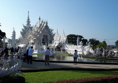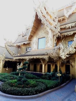 …Wat Rong Khun, der „weiße Tempel“. Dieser ist von einem reichen Künstler gebaut worden, ohne jedweden religiösen Hintergrund. Er versucht wohl nur durch diesen Tempel Interessenten für seine Bilder zu bekommen. Er ist wohl auch sehr extravagant und launisch. Gleich nach dem Eingang findet man...