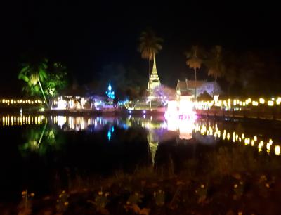 …Wat Mahathat, ein Tempel der sehr gut erhalten ist, speziell die vielen Skulpturen. Unser Guide Wan sagte uns das in der Zeit während wir das goldene Dreieck bereisen, hier in Thailand, das mehrere Tage dauernde, „Lichter- und Kerzenfest“ stattfindet. Hier in Sukothai haben wir dann erst realisiert welches Glück wir haben zu diesem Fest hier zu sein. Im Stadtpark werden…