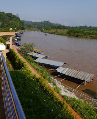 …von da sehen wir am Südufer das „Goldene Deieck“, dass durch das große Opiumanbaugebiet berühmt ist, aber einen schlecht Ruf hat. Hier treffen die Länder Laos, Myanmar und Thailand zusammen, so dass ein reger Handel, wie auch grenzüberschreitendes Arbeiten möglich macht. Hier besuchen wir auch das…